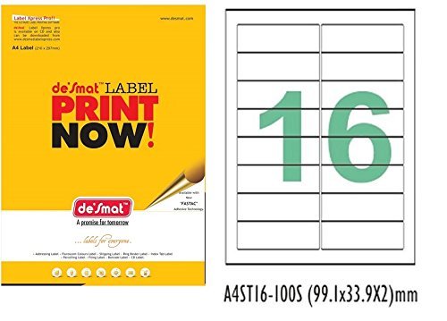 Desmat Paper Labels - Buy Desmat Paper Labels Online at Best Prices In ... Free delivery. DESMAT self Paper Label. White. ₹239. ₹ 325. 26% off. DESMAT A4 sheet 16 label and sticker Self-adhesive Pape... White. 4.6. Staples® Lithonia, GA, Lithonia, 30038 | Store Details 4351 Hugh Howell Rd. Tucker, GA 30084. (770) 621-3013. Get directions. Open Now - Closes at 9:00 PM. Store details. Desmat A4 Size Paper Labels For Laser, Inkjet & Copiers (84 Label Sheet ... These A4 size label sheets from Desmat can be used for addressing, parceling, shipping, coding, labeling and packaging, etc. These self-sticking labels are provided with premium quality adhesives. They can withstand laser printing or Inkjet and strand grip-on most surfaces. THese are made in India product. Vey high quality product A4 Labels A4ST16 [00140] : Desmat, A Rational Business Corporation Pvt ... A4ST16 are Paper labels with standard permanent adhesive. Each Sheet of A4 size has White label (s) with each label of size 99.1 x 33.9 . Designed for use with laser printers and inkjet printers or to be used as handwritten labels. Compatible with Avery label template number L7162 *