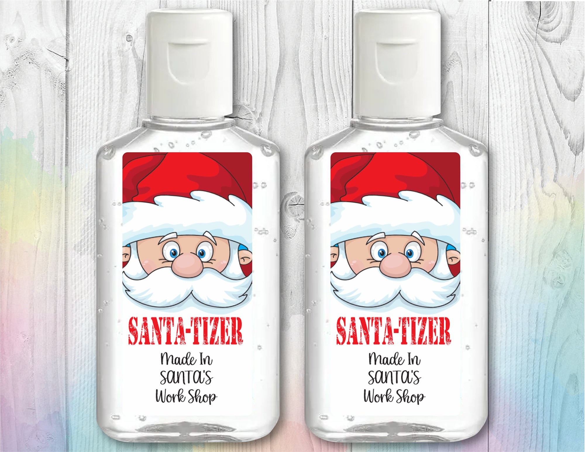 Quick Ship - Custom Sanitizer Labels - Hand Santa-tizer Stickers Our new custom hand sanitizer labels are just in time for giving out your little Christmas gifts. Add your own greeting and name at the bottom to make it easy to spread Holiday cheer, instead of germs.